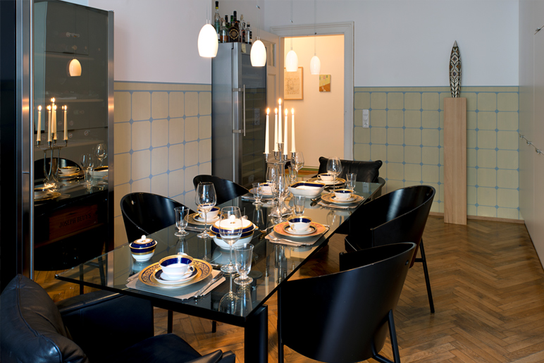 Malerarbeiten in einem denkmalgeschützten Gebäude in München-Schwabing, Wiederherstellung der original Wandmalerei.